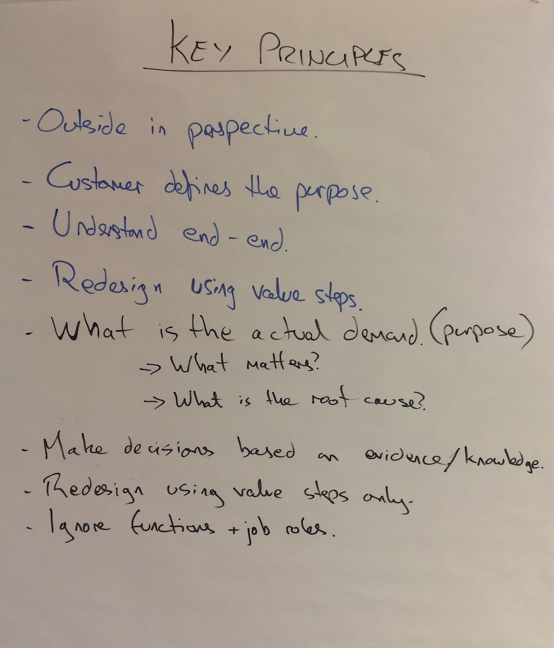 My role as the consultant was as a facilitator, and as a coach. I would give them the right tools at the right time, and they would develop the outcomes. So, no nice clean diagrams from me, they were all generated by the team.