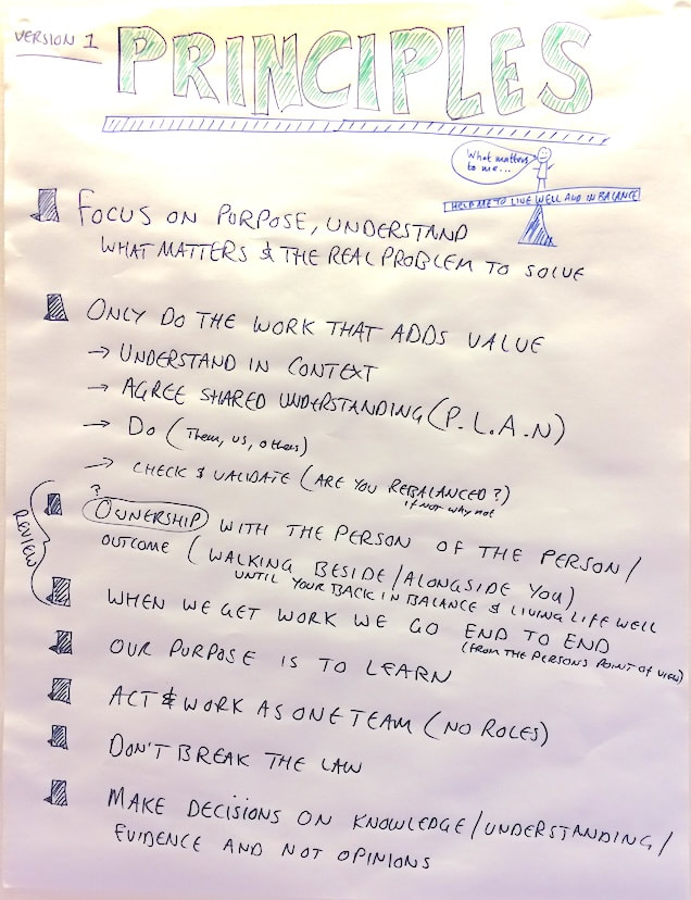 The approach that this piece of work took combined human learning principles with service design, complexity and system thinking, with a sprinkling of Lean. Each 'thinking' is woven into the overall method, so that in one morning, the conversations will always start with what matters to the end user, incorporate an end to end perspective, and talk about the real barriers int he organisation. We challenged everything.