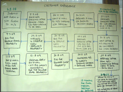 The manager and a team of front line staff got together to look at understanding the workflow as experienced buy the service users.