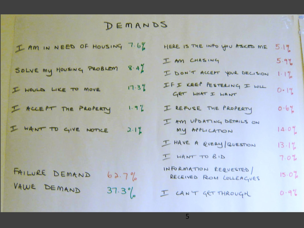 We then summarised a months demands into one sheet and split them into Value & Failure demands. The failure demands are those that are caused by the way we have designed the service itself. Therefore, we have the potential, when we redesign the service, to eliminate the failure demands.