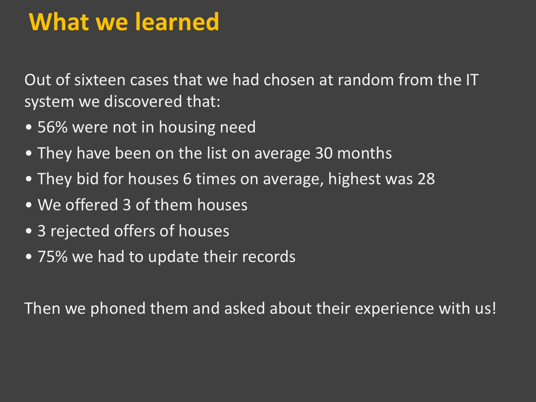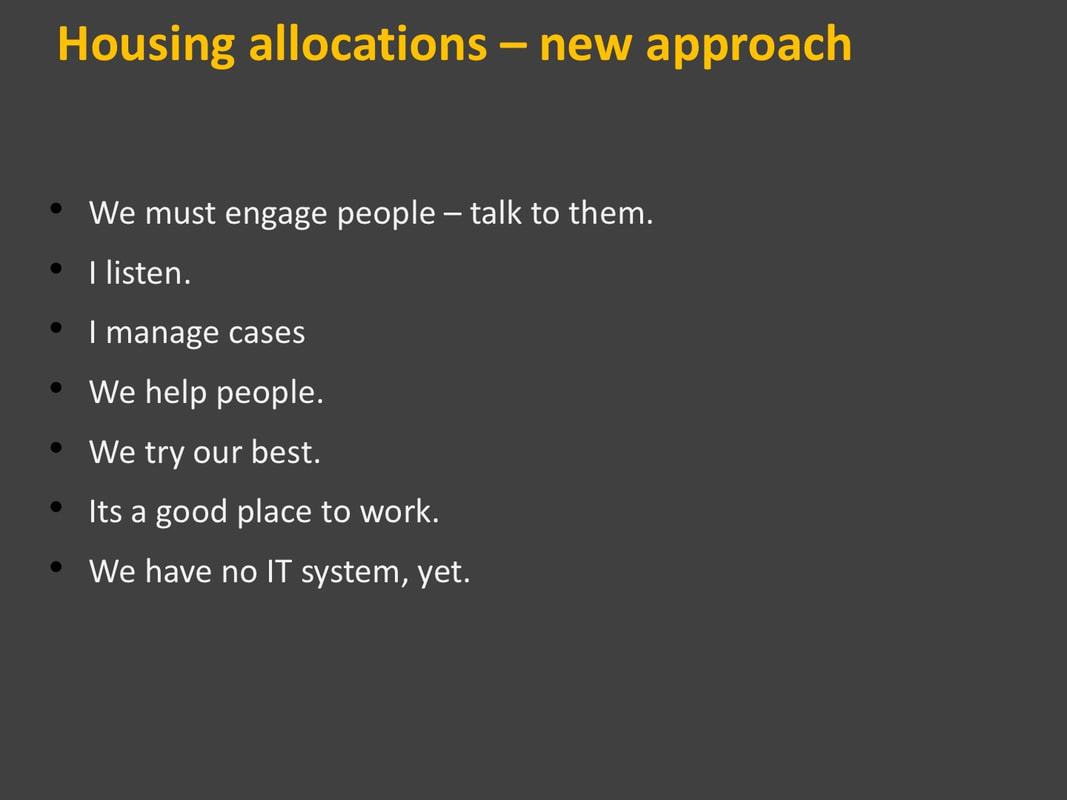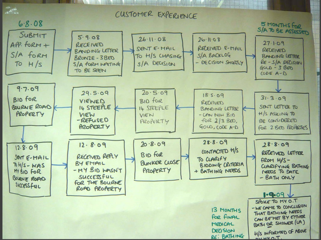 Kim Tugwell, Home Select Case Worker, said that spending all day ‘processing application forms’ felt like being ‘on a treadmill never getting anywhere’. The system also generated hostility and almost 10% of applicants appealed against their banding. For the team, the deeper learning then followed quickly after.