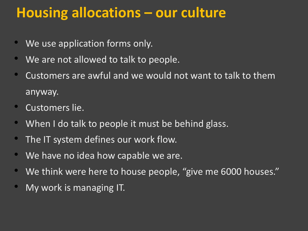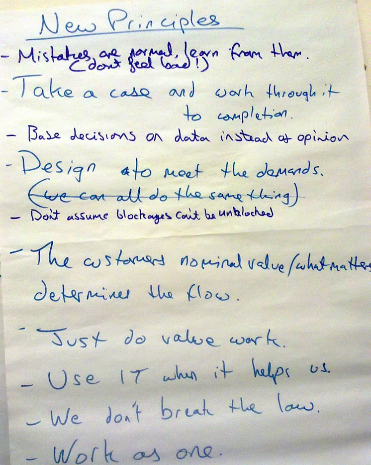 So conditioned were the team, that it took a great deal of debate and three phone calls to truly understand what mattered about how a service could best be delivered to the first demand we took in Housing. This role is the task of the facilitator that is leading the team. They guide the team away from their current thinking and behaviours, and incorporate new ones based on the principles.